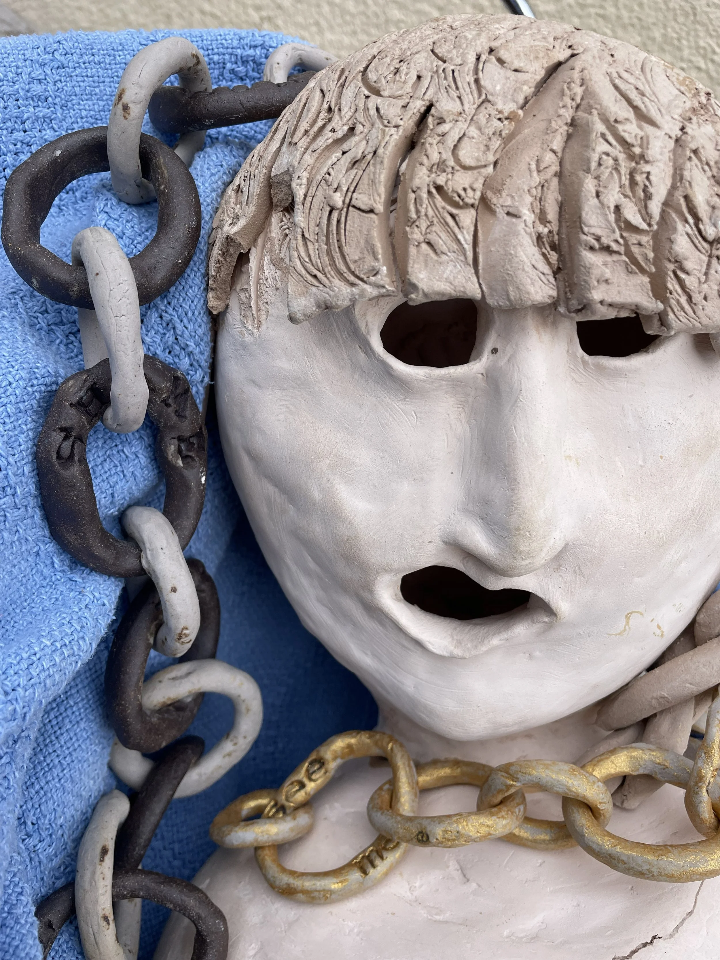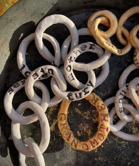 In a ceramics class during this time, I found myself shaping a clay baby, with a chain growing out of her umbilicus. I became aware that the chain was how I imagined my relationship to my family’s bloodline, especially my mother’s. The brittle links symbolized the estrangement I had always felt with my mother as she had with her mother, and so on back through the generations.